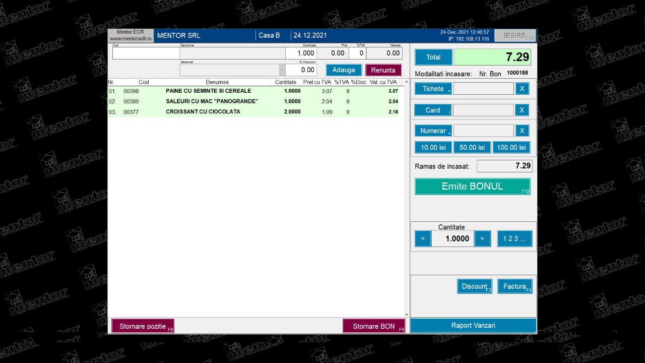 MentorSales este un program de vânzări folosit în magazine, cel mai cunoscut exemplu fiind Alfa Beta, cu o interfață frumoasă și ușor de manevrat de către orice vânzător. Funcționalitățile includ introducerea de noi produse în baza de date, scanarea produselor cu cod de bare, introducerea codurilor interne și menținerea adaosului după bunul plac al vânzătorilor de zi cu zi. Acest program este folosit de diferiți clienți, care sunt încântați de maleabilitatea programului. Cu o instruire rapidă a personalului, orice lucrător comercial va putea folosi programul nostru fără probleme, fiecare pas din cadrul unei vânzări fiind intuitiv.